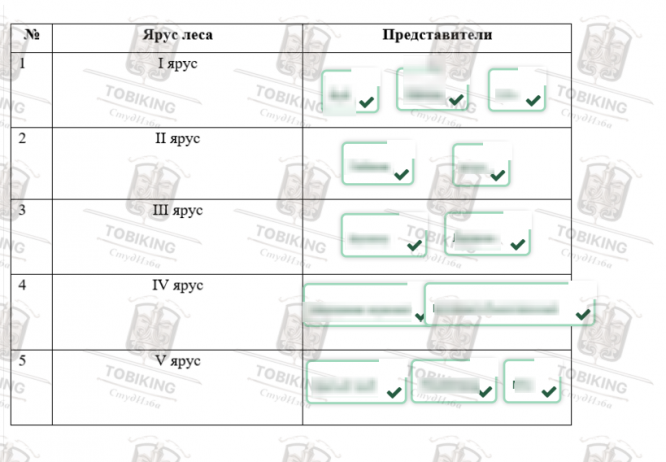 Ярус — элемент вертикальной структуры биоценоза. Ярусы различаются визуально, по неоднородности вертикального распределения фитомассы. В лесах ярусы образованы растениями отдельных жизненных форм. Первый ярус – древостой, далее – подрост, подлесок, травяной и мохово-лишайный. Установите соответствие между номером яруса леса и перечнем растений, которые для него характерны. Для этого переместите каждое предложенное понятие в соответствующую ячейку таблицы.