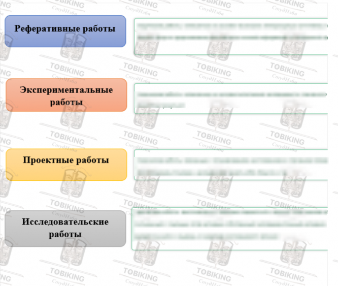 Установите соответствие между названием творческих работ в области естественных наук и его описанием. Для выполнения задания соотнесите содержание левосторонних (цветных) блоков схемы и правосторонних ее элементов. Сформируйте единую систему