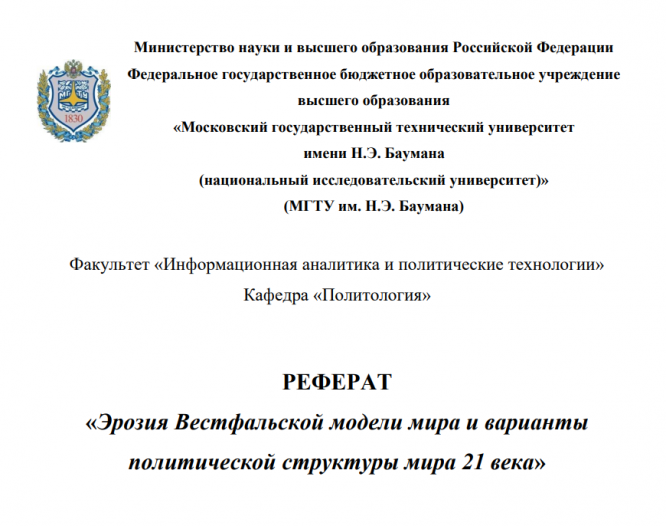 Для студентов МГТУ им. Н.Э.Баумана по предмету ПолитологияЭрозия Вестфальской модели мира и варианты политической структуры мира 21 векаЭрозия Вестфальской модели мира и варианты политической структуры мира 21 века