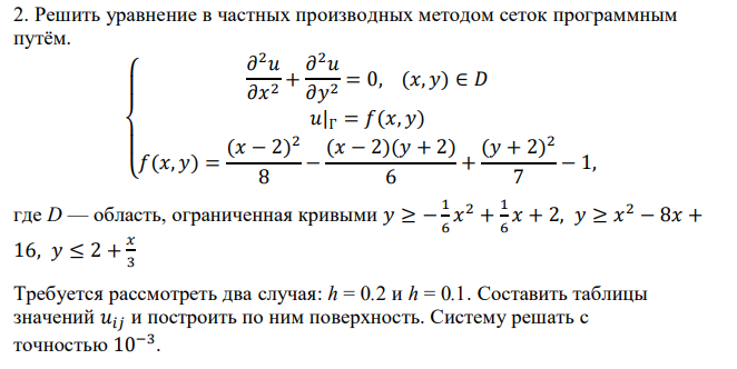 Требуется рассмотреть два случая: h = 0.2 и h = 0.1. Составить таблицы значений 𝑢𝑖𝑗 и построить по ним поверхность. Систему решать с точностью 10−3 .