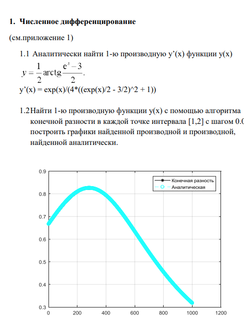 1. Численное дифференцирование 1.1 Аналитически найти 1-ю производную y’(x) функции y(x) (табл.1, № варианта - порядковый номер фамилии студента в списке группы); 1.2 Построить график полученной в п.2.1 производной y’(x) на интервале [1,2] с шагом 0.001; 1.3 Найти 1-ю производную функции y(x) с помощью алгоритма конечной разности в каждой точке интервала [1,2] с шагом 0.001, построить графики найденной производной и производной полученной в п.2.1; 1.4 Найти 1-ю производную функции y(x) с помощью ряда Тейлора (Макларена) в каждой точке интервала [1,2] с шагом 0.001, построить графики найденной производной и производной полученной в п.2.1; 1.5 Повторить пункты 1.3 и 1.4 для функции f(x) = y(x)+α*rand(1,n), где rand - встроенная в MATLAB функция генерации вектора квазислучайных чисел, α - коэффициент масштабирования искажающий исходную функцию y(x) на 1%, на 5% и на 10% по энергии. (энергию функции оценивать как сумму квадратов дискретных значений функции); 1.6 Для всех найденных численных значений производных найти расстояния в L2 со значениями производной, найденной аналитически.