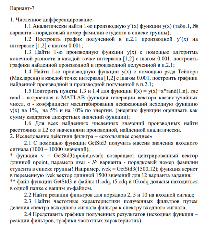 1. Численное дифференцирование 1.1 Аналитически найти 1-ю производную y’(x) функции y(x) (табл.1, № варианта - порядковый номер фамилии студента в списке группы); 1.2 Построить график полученной в п.2.1 производной y’(x) на интервале [1,2] с шагом 0.001; 1.3 Найти 1-ю производную функции y(x) с помощью алгоритма конечной разности в каждой точке интервала [1,2] с шагом 0.001, построить графики найденной производной и производной полученной в п.2.1; 1.4 Найти 1-ю производную функции y(x) с помощью ряда Тейлора (Макларена) в каждой точке интервала [1,2] с шагом 0.001, построить графики найденной производной и производной полученной в п.2.1; 1.5 Повторить пункты 1.3 и 1.4 для функции f(x) = y(x)+α*rand(1,n), где rand - встроенная в MATLAB функция генерации вектора квазислучайных чисел, α - коэффициент масштабирования искажающий исходную функцию y(x) на 1%, на 5% и на 10% по энергии. (энергию функции оценивать как сумму квадратов дискретных значений функции); 1.6 Для всех найденных численных значений производных найти расстояния в L2 со значениями производной, найденной аналитически. 2. Исследование действия фильтра – «скользящее среднее» 2.1 С помощью функции GetStd3 получить массив значения входного сигнала (1000 – 10000 значений); * функция v = GetStd3(npoint,nvar); возвращает центрированный вектор длинной npoint, параметр nvar - № варианта - порядковый номер фамилии студента в списке группы! Например, ivek = GetStd3(1500,12); функция вернет в переменную ivek вектор длинной 1500 значений для 12 варианта задания. ** файл функции GetStd3 и файлы t1.odq, t5.odq и tG.odq должны находиться в одной папке с вашим m-файлом. 2.2 Найти реакции фильтров для порядков 2, 5 и 10 на входной сигнал; 2.3 Найти частотные характеристики полученных фильтров путем деления спектра выходного сигнала фильтра к спектру входного сигнала; 2.4 Представить графики полученных результатов (исходная функция – реакции фильтров, графики частотных характеристик).