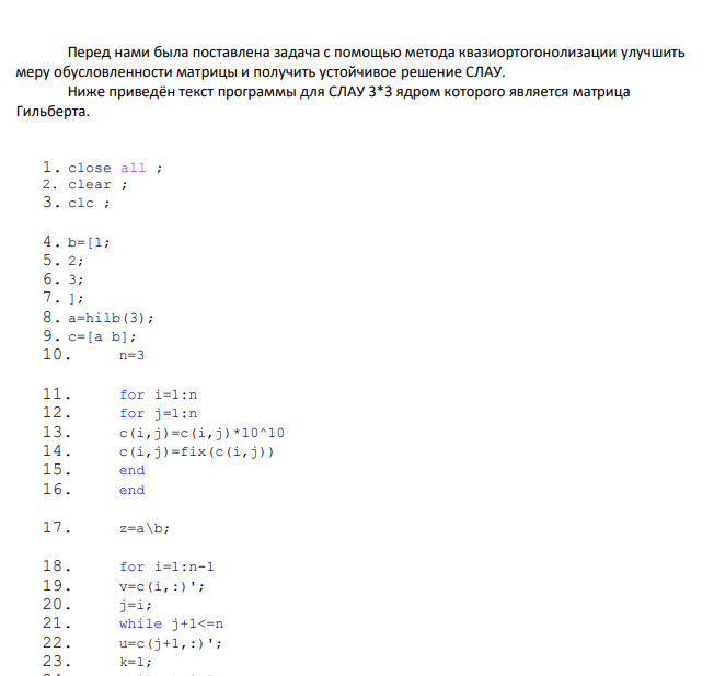 Перед нами была поставлена задача с помощью метода квазиортогонолизации улучшить меру обусловленности матрицы и получить устойчивое решение СЛАУ. Ниже приведён текст программы для СЛАУ 3*3 ядром которого является матрица Гильберта.