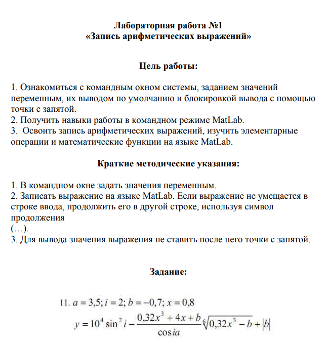 Цель работы: 1. Ознакомиться с командным окном системы, заданием значений переменным, их выводом по умолчанию и блокировкой вывода с помощью точки с запятой. 2. Получить навыки работы в командном режиме MatLab. 3. Освоить запись арифметических выражений, изучить элементарные операции и математические функции на языке MatLab.