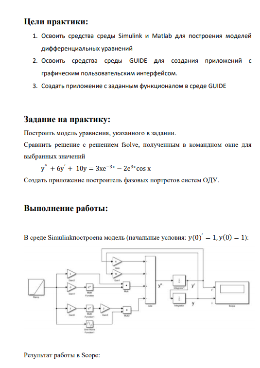 1. Освоить средства среды Simulink и Matlab для построения моделей дифференциальных уравнений 2. Освоить средства среды GUIDE для создания приложений с графическим пользовательским интерфейсом. 3. Создать приложение с заданным функционалом в среде GUIDE