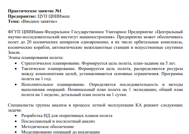 Практическое занятие №1 Предприятие: ЦУП ЦНИИмаш Тема: «Вводное занятие»