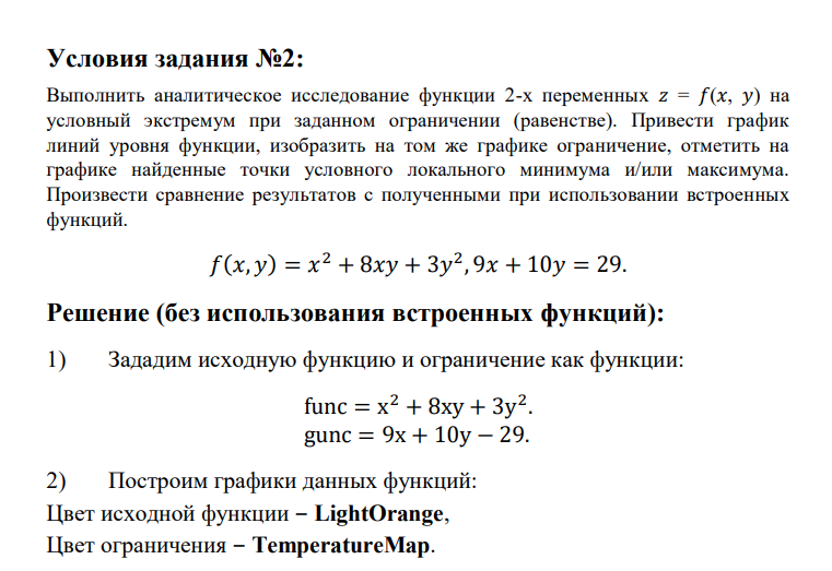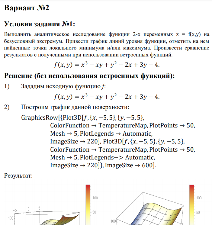 Условия задания №1: Выполнить аналитическое исследование функции 2-х переменных z = f(x,y) на безусловный экстремум. Привести график линий уровня функции, отметить на нем найденные точки локального минимума и/или максимума. Произвести сравнение результатов с полученными при использовании встроенных функций.