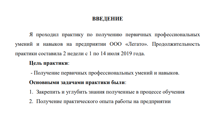 Я проходил практику по получению первичных профессиональных уменийи навыковна предприятии ООО «Легато». Продолжительность практики составила 2 неделис 1 по 14июля 2019года.