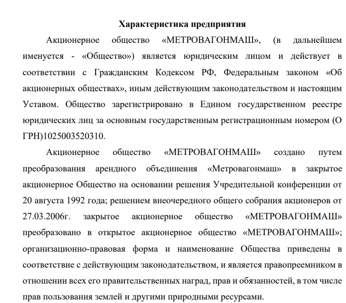 Практику я проходила в АО «МЕТРОВАГОНМАШ». Данное предприятие занимается разработкой и производством подвижного состава для метрополитенов и железных дорог.Целью данной работы является изучение производственной и финансовой деятельности предприятияАО «МЕТРОВАГОНМАШ»и проведение анализа финансово-хозяйственной деятельности данного предприятия.