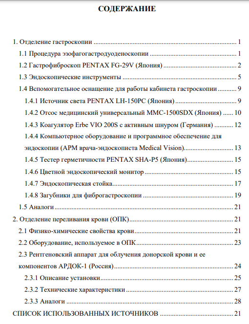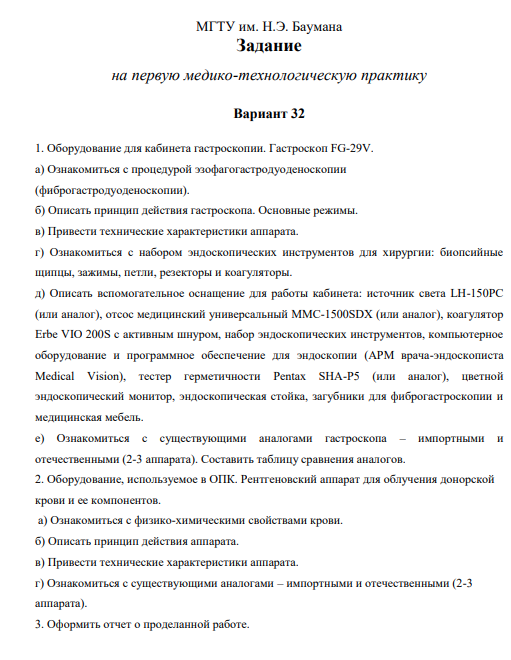 Вариант 32 1. Оборудование для кабинета гастроскопии. Гастроскоп FG-29V. а) Ознакомиться с процедурой эзофагогастродуоденоскопии (фиброгастродуоденоскопии). б) Описать принцип действия гастроскопа. Основные режимы. в) Привести технические характеристики аппарата. г) Ознакомиться с набором эндоскопических инструментов для хирургии: биопсийные щипцы, зажимы, петли, резекторы и коагуляторы. д) Описать вспомогательное оснащение для работы кабинета: источник света LH-150PC (или аналог), отсос медицинский универсальный MMC-1500SDX (или аналог), коагулятор Erbe VIO 200S с активным шнуром, набор эндоскопических инструментов, компьютерное оборудование и программное обеспечение для эндоскопии (АРМ врача-эндоскописта Medical Vision), тестер герметичности Pentax SHA-P5 (или аналог), цветной эндоскопический монитор, эндоскопическая стойка, загубники для фиброгастроскопии и медицинская мебель. е) Ознакомиться с существующими аналогами гастроскопа – импортными и отечественными (2-3 аппарата). Составить таблицу сравнения аналогов. 2. Оборудование, используемое в ОПК. Рентгеновский аппарат для облучения донорской крови и ее компонентов. а) Ознакомиться с физико-химическими свойствами крови. б) Описать принцип действия аппарата. в) Привести технические характеристики аппарата. г) Ознакомиться с существующими аналогами – импортными и отечественными (2-3 аппарата). 3. Оформить отчет о проделанной работе