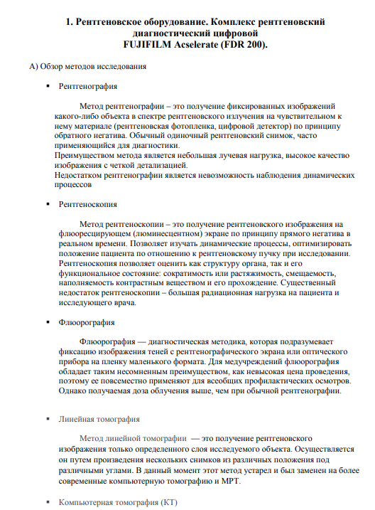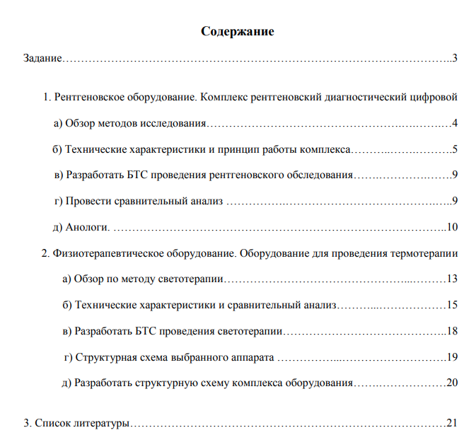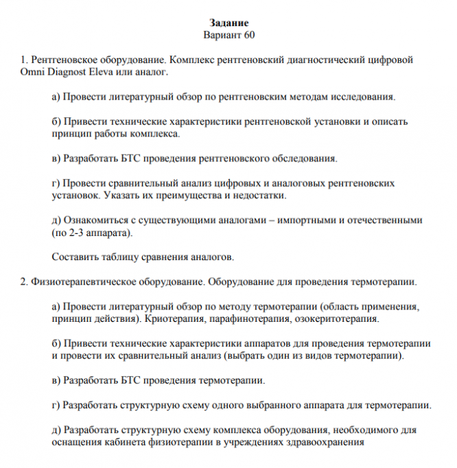 1. Рентгеновское оборудование. Комплекс рентгеновский диагностический цифровой Omni Diagnost Eleva или аналог. а) Провести литературный обзор по рентгеновским методам исследования. б) Привести технические характеристики рентгеновской установки и описать принцип работы комплекса. в) Разработать БТС проведения рентгеновского обследования. г) Провести сравнительный анализ цифровых и аналоговых рентгеновских установок. Указать их преимущества и недостатки. д) Ознакомиться с существующими аналогами – импортными и отечественными (по 2-3 аппарата). Составить таблицу сравнения аналогов. 2. Физиотерапевтическое оборудование. Оборудование для проведения термотерапии. а) Провести литературный обзор по методу термотерапии (область применения, принцип действия). Криотерапия, парафинотерапия, озокеритотерапия. б) Привести технические характеристики аппаратов для проведения термотерапии и провести их сравнительный анализ (выбрать один из видов термотерапии). в) Разработать БТС проведения термотерапии. г) Разработать структурную схему одного выбранного аппарата для термотерапии. д) Разработать структурную схему комплекса оборудования, необходимого для оснащения кабинета физиотерапии в учреждениях здравоохранения