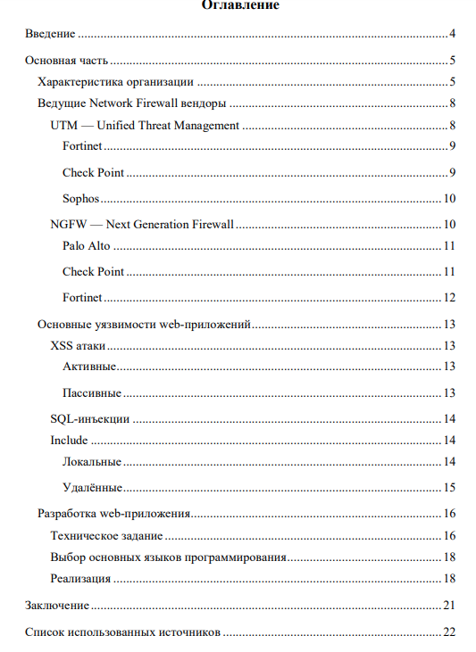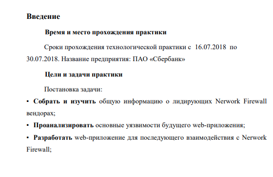 Тип практики: производственная Название предприятия: ПАО «Сбербанк» Сроки практики: с 16 июля 2018 г. по 30 июля 2018 г. Специальность: 10.05.03 «Информационная безопасность автоматизированных систем» За время прохождения практики студенту надлежит согласно программе практики: ▪ Собрать и изучить общую информацию о лидирующих Network Firewall вендорах; ▪ Проанализировать основные уязвимости будущего web-приложения; ▪ Разработать web-приложение для последующего взаимодействия с Network Firewall;