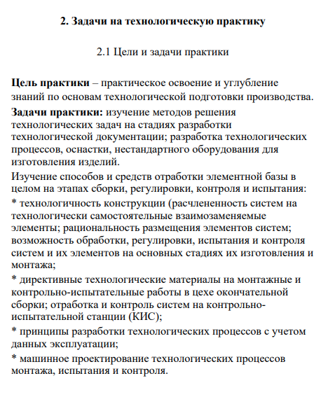 Задачи практики: изучение методов решения технологических задач на стадиях разработки технологической документации; разработка технологических процессов, оснастки, нестандартного оборудования для изготовления изделий. Изучение способов и средств отработки элементной базы в целом на этапах сборки, регулировки, контроля и испытания: * технологичность конструкции (расчлененность систем на технологически самостоятельные взаимозаменяемые элементы; рациональность размещения элементов систем; возможность обработки, регулировки, испытания и контроля систем и их элементов на основных стадиях их изготовления и монтажа; * директивные технологические материалы на монтажные и контрольно-испытательные работы в цехе окончательной сборки; отработка и контроль систем на контрольноиспытательной станции (КИС); * принципы разработки технологических процессов с учетом данных эксплуатации; * машинное проектирование технологических процессов монтажа, испытания и контроля.