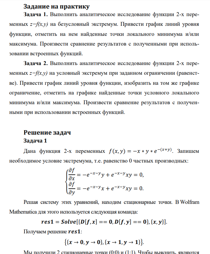 Задача 1. Выполнить аналитическое исследование функции 2-х переменных z=f(x,y) на безусловный экстремум. Привести график линий уровня функции, отметить на нем найденные точки локального минимума и/или максимума. Произвести сравнение результатов с полученными при использовании встроенных функций.