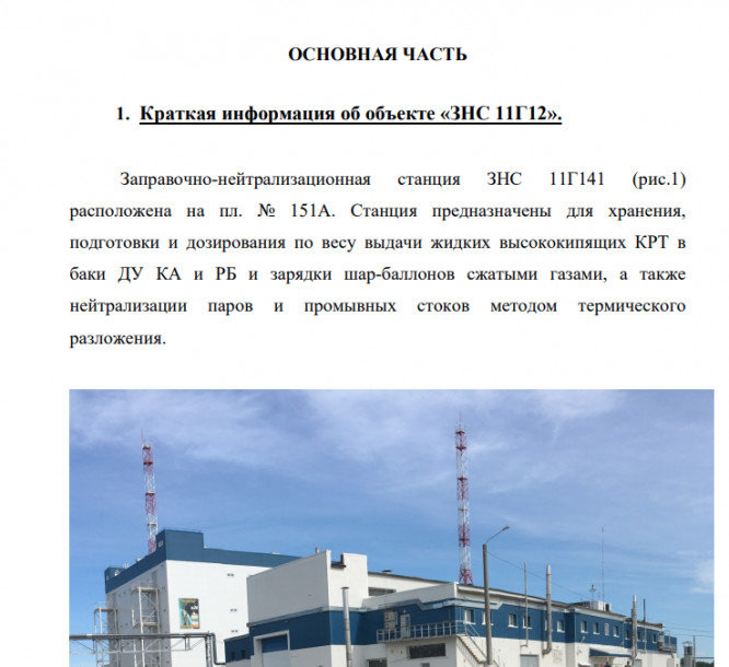 Заправочно-нейтрализационная станция ЗНС 11Г141 (рис.1) расположена на пл. № 151А. Станция предназначены для хранения, подготовки и дозирования по весу выдачи жидких высококипящих КРТ в баки ДУ КА и РБ и зарядки шар-баллонов сжатыми газами, а также нейтрализации паров и промывных стоков методом термического разложения.