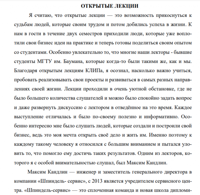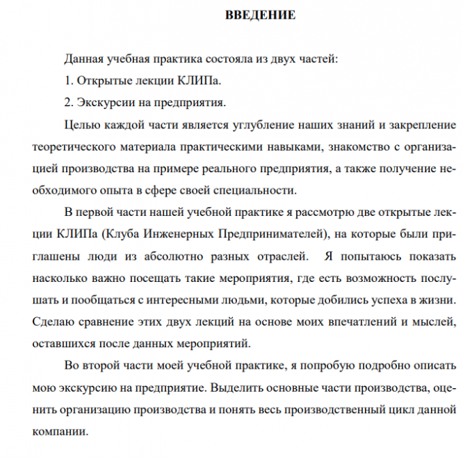 Данная учебная практика состояла из двух частей: 1. Открытые лекции КЛИПа. 2. Экскурсии на предприятия. Целью каждой части является углубление наших знаний и закрепление теоретического материала практическими навыками, знакомство с организацией производства на примере реального предприятия, а также получение необходимого опыта в сфере своей специальности. В первой части нашей учебной практике я рассмотрю две открытые лекции КЛИПа (Клуба Инженерных Предпринимателей), на которые были приглашены люди из абсолютно разных отраслей. Я попытаюсь показать насколько важно посещать такие мероприятия, где есть возможность послушать и пообщаться с интересными людьми, которые добились успеха в жизни. Сделаю сравнение этих двух лекций на основе моих впечатлений и мыслей, оставшихся после данных мероприятий. Во второй части моей учебной практике, я попробую подробно описать мою экскурсию на предприятие. Выделить основные части производства, оценить организацию производства и понять весь производственный цикл данной компании