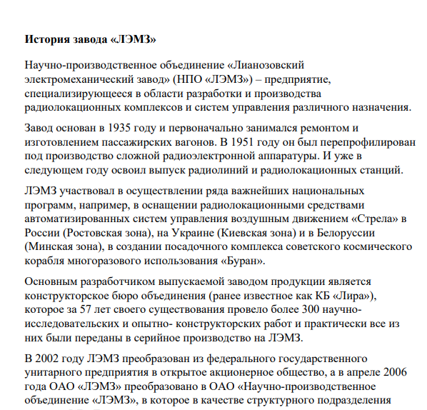 Научно-производственное объединение «Лианозовский электромеханический завод» (НПО «ЛЭМЗ») – предприятие, специализирующееся в области разработки и производства радиолокационных комплексов и систем управления различного назначения. Завод основан в 1935 году и первоначально занимался ремонтом и изготовлением пассажирских вагонов. В 1951 году он был перепрофилирован под производство сложной радиоэлектронной аппаратуры. И уже в следующем году освоил выпуск радиолиний и радиолокационных станций. ЛЭМЗ участвовал в осуществлении ряда важнейших национальных программ, например, в оснащении радиолокационными средствами автоматизированных систем управления воздушным движением «Стрела» в России (Ростовская зона), на Украине (Киевская зона) и в Белоруссии (Минская зона), в создании посадочного комплекса советского космического корабля многоразового использования «Буран»