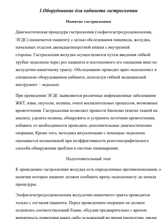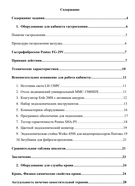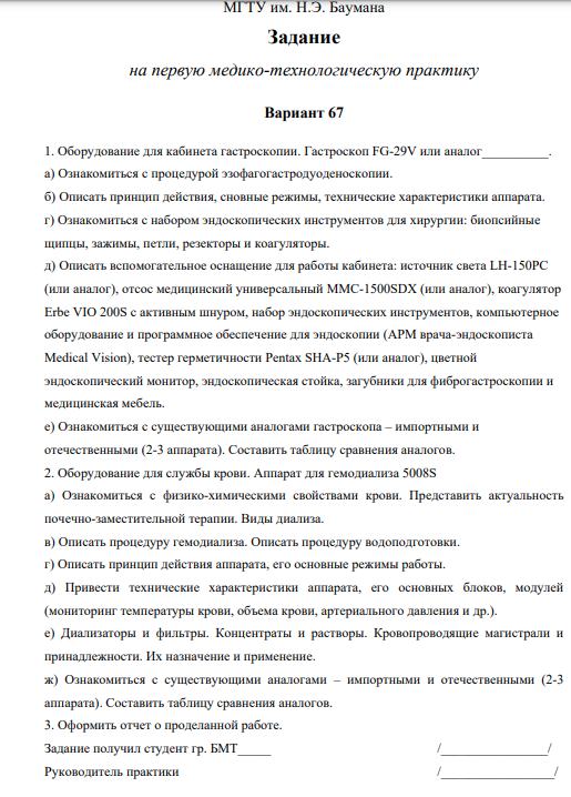 1. Оборудование для кабинета гастроскопии. Гастроскоп FG-29V или аналог__________. а) Ознакомиться с процедурой эзофагогастродуоденоскопии. б) Описать принцип действия, сновные режимы, технические характеристики аппарата. г) Ознакомиться с набором эндоскопических инструментов для хирургии: биопсийные щипцы, зажимы, петли, резекторы и коагуляторы. д) Описать вспомогательное оснащение для работы кабинета: источник света LH-150PC (или аналог), отсос медицинский универсальный MMC-1500SDX (или аналог), коагулятор Erbe VIO 200S с активным шнуром, набор эндоскопических инструментов, компьютерное оборудование и программное обеспечение для эндоскопии (АРМ врача-эндоскописта Medical Vision), тестер герметичности Pentax SHA-P5 (или аналог), цветной эндоскопический монитор, эндоскопическая стойка, загубники для фиброгастроскопии и медицинская мебель. е) Ознакомиться с существующими аналогами гастроскопа – импортными и отечественными (2-3 аппарата). Составить таблицу сравнения аналогов. 2. Оборудование для службы крови. Аппарат для гемодиализа 5008S а) Ознакомиться с физико-химическими свойствами крови. Представить актуальность почечно-заместительной терапии. Виды диализа. в) Описать процедуру гемодиализа. Описать процедуру водоподготовки. г) Описать принцип действия аппарата, его основные режимы работы. д) Привести технические характеристики аппарата, его основных блоков, модулей (мониторинг температуры крови, объема крови, артериального давления и др.). е) Диализаторы и фильтры. Концентраты и растворы. Кровопроводящие магистрали и принадлежности. Их назначение и применение. ж) Ознакомиться с существующими аналогами – импортными и отечественными (2-3 аппарата). Составить таблицу сравнения аналогов. 3. Оформить отчет о проделанной работе.