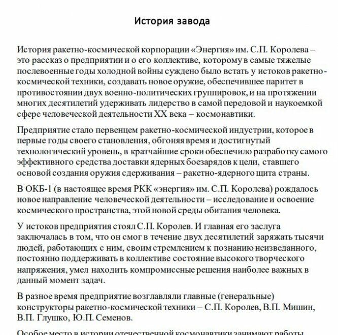История ракетно-космической корпорации «Энергия» им. С.П. Королева – это рассказ о предприятии и о его коллективе, которому в самые тяжелые послевоенные годы холодной войны суждено было встать у истоков ракетнокосмической техники, создавать новое оружие, обеспечившее паритет в противостоянии двух военно-политических группировок, и на протяжении многих десятилетий удерживать лидерство в самой передовой и наукоемкой сфере человеческой деятельности ХХ века – космонавтики. Предприятие стало первенцем ракетно-космической индустрии, которое в первые годы своего становления, обгоняя время и достигнутый технологический уровень, в кратчайшие сроки обеспечило разработку самого эффективного средства доставки ядерных боезарядов к цели, ставшего основой создания оружия сдерживания – ракетно-ядерного щита страны