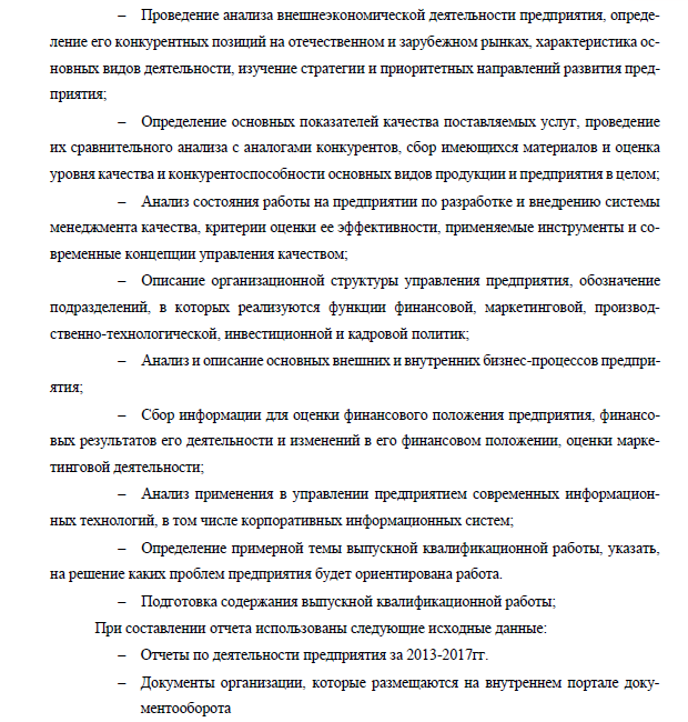 • определить примерную тему выпускной квалификационной работы, предложить ее содержание, подготовить материалы по деятельности предприятия, требуемые для выполнения выпускной квалификационной работы.