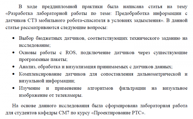 Отчет по преддипломной практике (Статья на тему "Разработка лабораторной работы по теме: Предобработка информации с датчиков СТЗ мобильного робота-спасателя в условиях задымления")