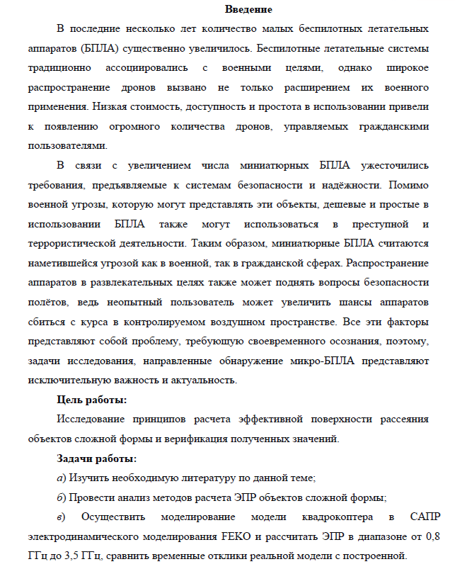 Осуществить моделирование модели квадрокоптера в САПР электродинамического моделирования FEKO и рассчитать ЭПР в диапазоне от 0,8 ГГц до 3,5 ГГц, сравнить временные отклики реальной модели с построенной моделью.