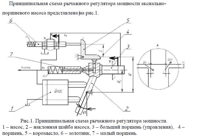Принцип работы регулятора состоит в следующем: давление нагнетания из насоса 1 поступает под торец поршня 4, действующего на коромысло 5, в камеру малого поршня 7, а также в золотник 6. При повышении давления «Pn» в напорной линии насоса, жидкость под давлением давит на торец поршня 4. Поршень 4 давит на L-образное коромысло 5, тем самым поворачивая его против часовой стрелки. Вследствие поворота коромысла смещается управляющий золотник 6 (рис. 2).