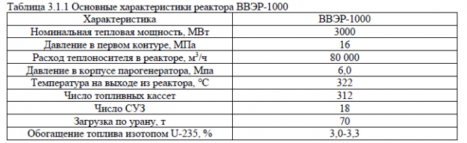 Реактор ВВЭР-1000 – водо-водяной энергетический корпусной реактор с водой под давлением, тепловая мощность - 3000 МВт. Топливо – обогащённый диоксид урана.