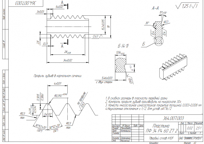 В рамках производственной практики было получено задание на разработку операционной технологии изготовления корпуса и твердосплавной пластины сборной резьбовой фрезы 364.007.000. В данном инструменте твердосплавные пластины имеют 4 режущих части, что по сравнению с обыкновенным резьбовыми пластинами, увеличивает ресурс в 2 раза. Базирование пластины в корпусе осуществляется по специальным плоскостям по краям пластины, что как раз и позволяет изготовить дополнительные режущие зубья. В корпусе пластина крепится при помощи клина, который соединяется с корпусом при помощи дифференциального винта М6. Данное решение ускоряет и упрощает замену и переустановку твердосплавных пластин.