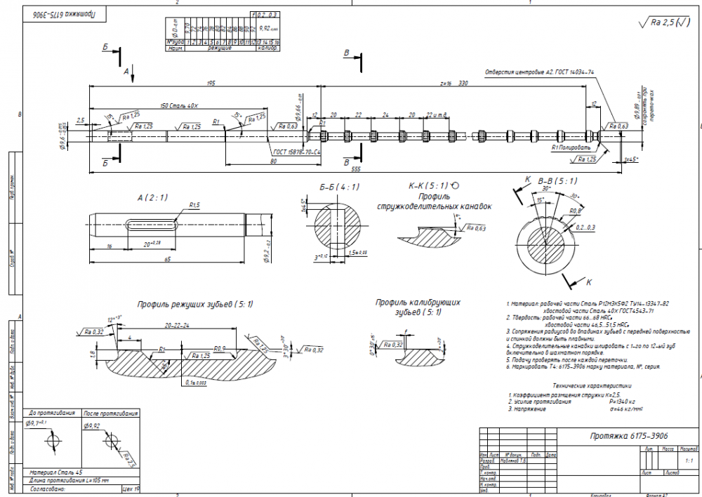 Круглая протяжка 6175 – 3906 – инструмент типа тела вращения, является сочетанием цилиндрических и конических поверхностей, удобных в обработке, что позволяет большую часть обработки вести на одном оборудовании. Конструктивные формы детали не представляют особой сложности и позволяют вести обработку на универсальном оборудовании или оборудовании с ЧПУ.