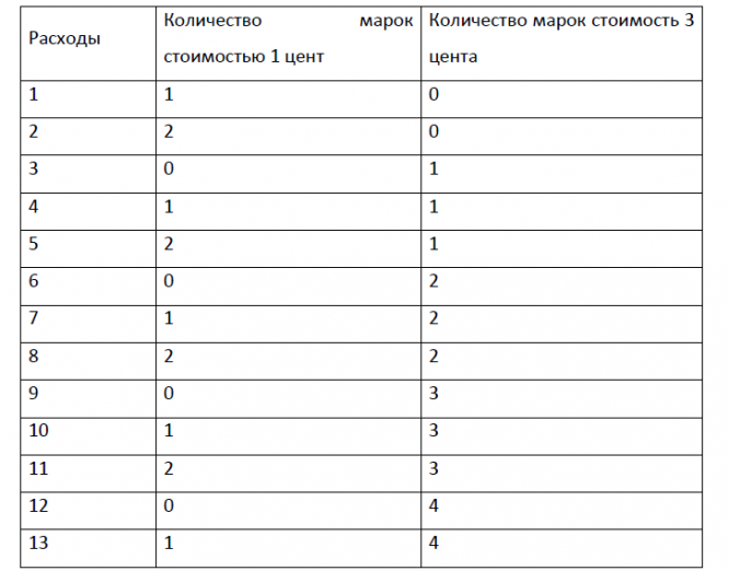 Филателисты начали собирать марки задолго до того, как почтовые работники заволновались. Избыток марок может стать плохой новостью для почтовых служб страны, но хорошей новостью для тех, кто коллекционирует марки. Для уменьшения количества марок этим службам необходимо обеспечить полное освещение почтовых расходов. С этой целью вы должны написать программу.
