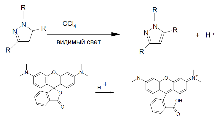 Реакции гетаренов, индуцированные их нековалентными взаимодействиями - облучение, эффекты растворителя, комплексообразование с переносом заряда, интеркалирование в биологические мишени – лежат в основе многих современных подходов при создании новых наноструктурированнных сенсорных материалов и элементов. Ранее был изучен ряд реакций производных кумарина, индуцированных облучением или эффектами растворителя и сопровождаемых значительными изменениями флуоресценции системы. В частности, синтезированы пиразолинилкумарины, способные выступать в качестве фотогенераторов кислот и активировать флуоресценцию лактонных форм родаминовых лазерных красителей (в частности, родамина В и Родамина 19). Созданы композиции, пригодные для двухфотонной записи информации в полимерных пленках и защищенные патентом РФ № 2478116 от 27.03.2013 г. (схема 1).