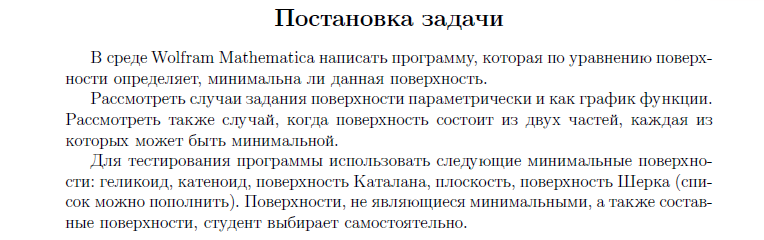 Для студентов МГТУ им. Н.Э.Баумана по предмету Практикум по применению математических пакетовИсследование поверхности в пространстве на минимальность в системе компьютерной алгебры Wolfram MathematicaИсследование поверхности в пространстве на минимальность в системе компьютерной алгебры Wolfram Mathematica
