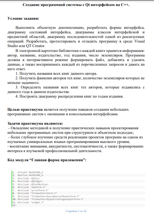 Выполнить объектную декомпозицию, разработать формы интерфейса, диаграмму состояний интерфейса, диаграммы классов интерфейсной и предметной областей, диаграмму последовательностей одной из реализуемых операций. Разработать, протестировать и отладить программу в среде Visual Studio или QT Creator. В электронной картотеке библиотеки о каждой книге хранится информация: автор, название, издательство, год издания, число экземпляров. Программа должна в интерактивном режиме формировать файл, добавлять и удалять данные, а также воспринимать каждый из перечисленных запросов и давать на него ответ.
