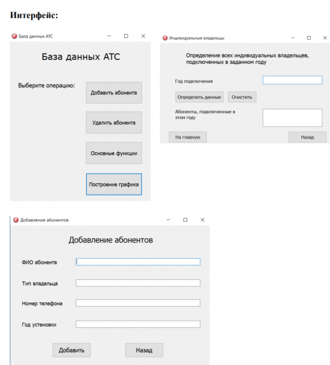 База данных АТС содержит следующие сведения об абонентах: ФИО абонента, тип владельца (индивидуальный, коллективный), номер телефона, год установки. Программа должна в интерактивном режиме формировать файл, добавлять и удалять данные, а также воспринимать каждый из перечисленных запросов и давать на него ответ.