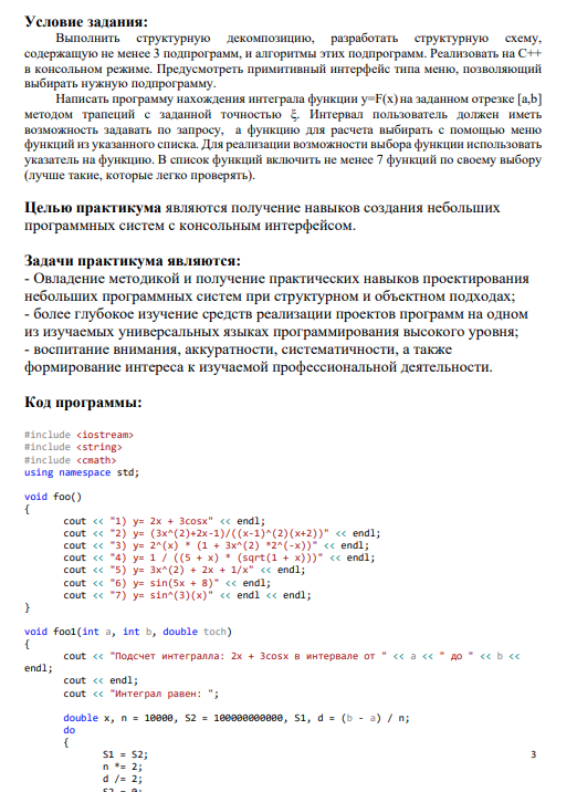Выполнить структурную декомпозицию, разработать структурную схему, содержащую не менее 3 подпрограмм, и алгоритмы этих подпрограмм. Реализовать на С++ в консольном режиме. Предусмотреть примитивный интерфейс типа меню, позволяющий выбирать нужную подпрограмму. Написать программу нахождения интеграла функции y=F(x) на заданном отрезке [a,b] методом трапеций с заданной точностью ξ. Интервал пользователь должен иметь возможность задавать по запросу, а функцию для расчета выбирать с помощью меню функций из указанного списка. Для реализации возможности выбора функции использовать указатель на функцию. В список функций включить не менее 7 функций по своему выбору (лучше такие, которые легко проверять).