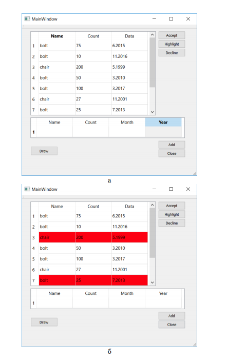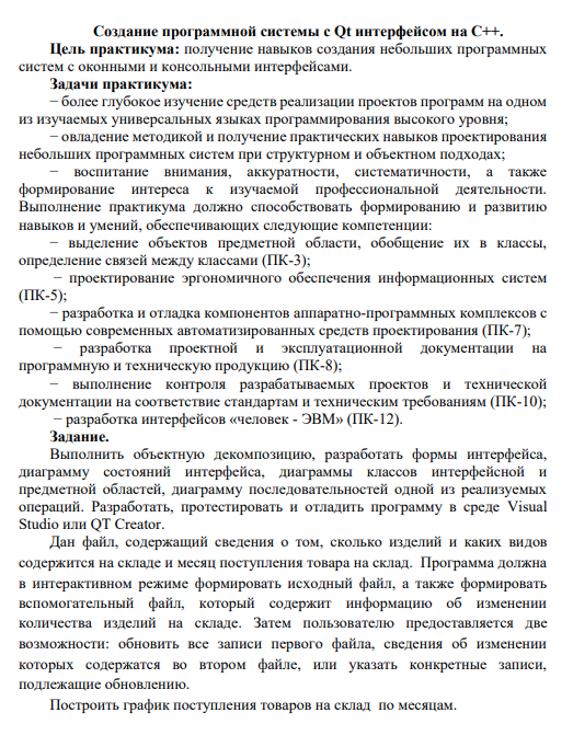 Выполнить объектную декомпозицию, разработать формы интерфейса, диаграмму состояний интерфейса, диаграммы классов интерфейсной и предметной областей, диаграмму последовательностей одной из реализуемых операций. Разработать, протестировать и отладить программу в среде Visual Studio или QT Creator. Дан файл, содержащий сведения о том, сколько изделий и каких видов содержится на складе и месяц поступления товара на склад. Программа должна в интерактивном режиме формировать исходный файл, а также формировать вспомогательный файл, который содержит информацию об изменении количества изделий на складе. Затем пользователю предоставляется две возможности: обновить все записи первого файла, сведения об изменении которых содержатся во втором файле, или указать конкретные записи, подлежащие обновлению. Построить график поступления товаров на склад по месяцам.