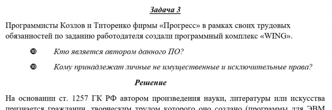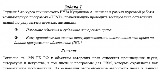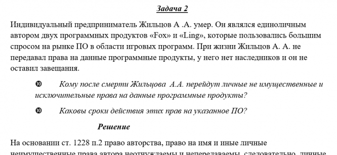 Задача 1 Студент 5-го курса технического ВУЗа Куприянов А. написал в рамках курсовой работы компьютерную программу «TEST», позволяющую проводить тестирование остаточных знаний по ряду математических дисциплин. Назовите объекты и субъекты авторского права. Кому принадлежат личные неимущественные и исключительные права на данное программное обеспечение (ПО)?  Задача 2 Индивидуальный предприниматель Жильцов А .А. умер. Он являлся единоличным автором двух программных продуктов «Fox» и «Ling», которые пользовались большим спросом на рынке ПО в области игровых программ. При жизни Жильцов А. А. не передавал права на данные программные продукты, у него нет наследников и он не оставил завещания.
