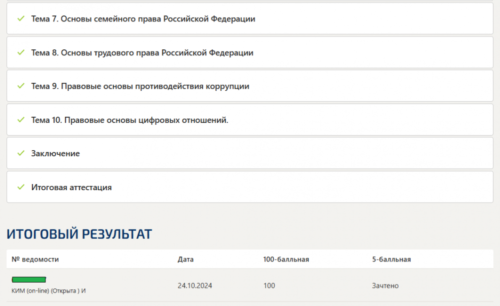 Дата сдачи 24.12.2024. Ответы актуальны. Итоговый результат 100 баллов из 100 (Отлично). ТЕСТЫ 1-10. Промежуточные тесты/Итоговый тест/Компетентностный тест Полный сборник вопросов с ответами. Ответы в файле выделены. Для удобства поиска не забывайся про комбинацию "Ctrl+F" для поиска файлу. Правоведение тесты 1-10 + Итоговая аттестация + Итоговый тест (все вопросы вместе). Новые ответы на все вопросоы на отлично! Синергия/МОИ/МТИ/МОСАП. УЧЕБНЫЕ МАТЕРИАЛЫ Введение в курс Тема 1. Основы учения о государстве и теории права Тема 2. Основы конституционного права Российской Федерации Тема 3. Основы административного права Российской Федерации Тема 4. Основы уголовного права Российской Федерации Тема 5.