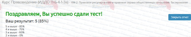 Ответы к заданиям КМ-2: КМ-2. Правовое регулирование и правовая охрана общественных отношений. Тестирование - 85%