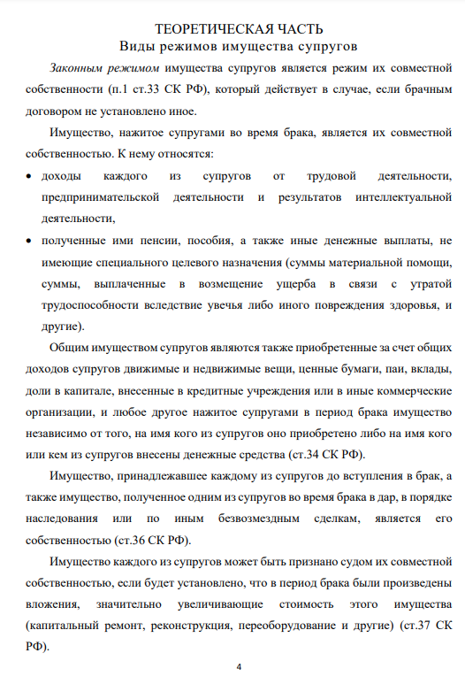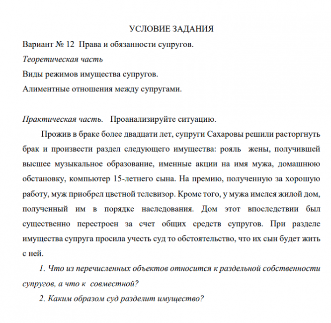 Вариант № 12 Права и обязанности супругов. Теоретическая часть Виды режимов имущества супругов. Алиментные отношения между супругами. Практическая часть. Проанализируйте ситуацию. Прожив в браке более двадцати лет, супруги Сахаровы решили расторгнуть брак и произвести раздел следующего имущества: рояль жены, получившей высшее музыкальное образование, именные акции на имя мужа, домашнюю обстановку, компьютер 15-летнего сына. На премию, полученную за хорошую работу, муж приобрел цветной телевизор. Кроме того, у мужа имелся жилой дом, полученный им в порядке наследования. Дом этот впоследствии был существенно перестроен за счет общих средств супругов. При разделе имущества супруга просила учесть суд то обстоятельство, что их сын будет жить с ней. 1. Что из перечисленных объектов относится к раздельной собственности супругов, а что к совместной? 2. Каким образом суд разделит имущество?