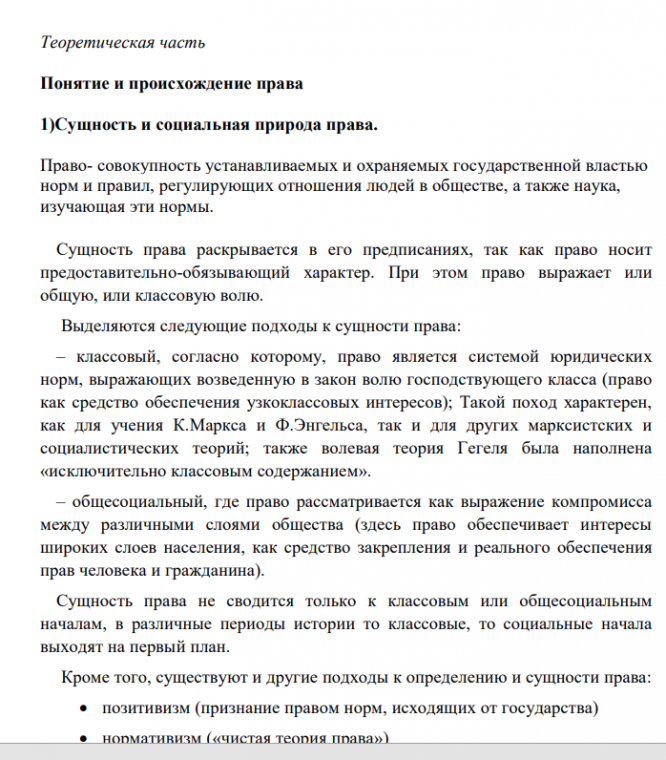 Теоретическая частьПонятие и происхождение права 1)Сущность и социальная природа права. Право- совокупность устанавливаемых и охраняемых государственной властью норм и правил, регулирующих отношения людей в обществе, а также наука, изучающая эти нормы. Сущность права раскрывается в его предписаниях, так как право носит предоставительно-обязывающий характер. При этом право выражает или общую, или классовую волю