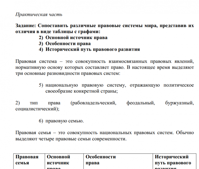 Задание: Сопоставить различные правовые системы мира, представив их отличия в виде таблицы с графами: 2) Основной источник права 3) Особенности права 4) Исторический путь правового развития