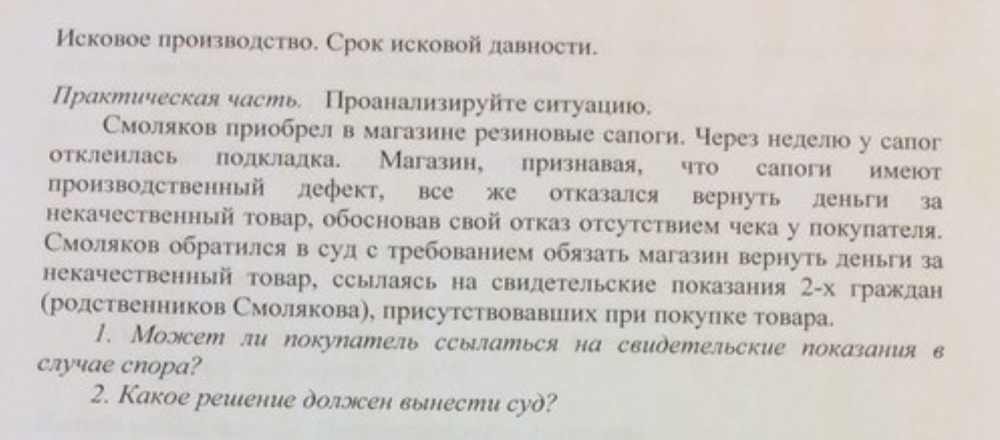 - Проанализируйте ситуацию: Смоляков приобрел в магазине резиновые сапоги. Через неделю у сапог отклеилась подкладка. Магазин, признавая, что сапоги имеют производственный дефект, все же отказалась вернуть деньги за некачественный товар, обосновав свой отказ отсутствием чека у покупателя. Смоляков обратился в суд с требованием обязать магазин вернуть деньги за некачественный товар, ссылаясь на свидетельские показания двух граждан (родственники Смолякова), присутствовавших при покупке товара.