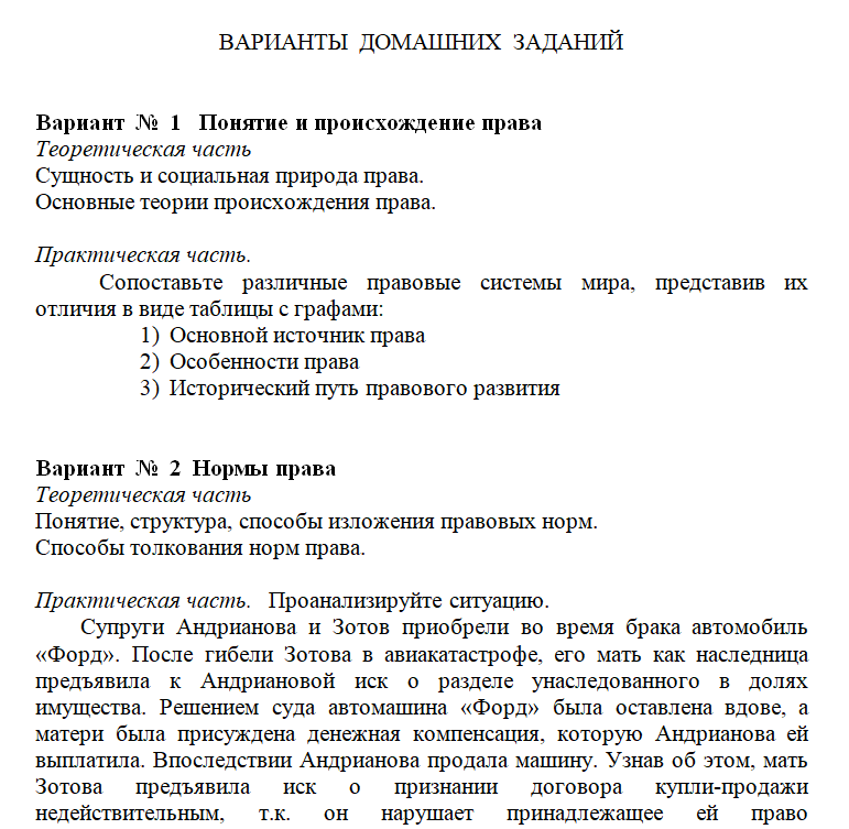 Защита домашнего задания осуществляется на семинарском занятии. Студент, не представивший домашнего задания в срок или не защитивший его, не допускается к сдаче зачета по дисциплине «Правоведение». Домашнее задание состоит из двух теоретических вопросов, одного практического задания в форме таблицы, эссе или задачи. Студент выбирает номер варианта домашнего задания в соответствии со своим номером в списке группы. Ответы на теоретические вопросы и выполнение практической части домашнего задания должны логически стройно отражать тему исследования. В ходе написания домашнего задания рекомендуется использовать не менее 5 источников из числа нормативных правовых актов, учебников, учебных пособий, монографий, сборников научных статей, журнальной и газетной периодики, материалов судебной практики.