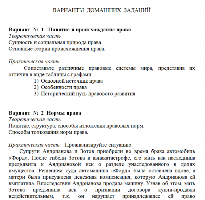 Оформление домашнего задания: - образец оформления титульного листа прилагается; - работа выполняется на одной стороне стандартных листов формата А4. Объём работы должен составлять 7 - 10 страниц текста. Компьютерный текст набирается шрифтом TimesNewRoman, 14 размера с полуторным интервалом. Абзацный отступ - 1,25 см. Напечатанный текст должен иметь поля: верхнее - 20 мм, правое - 10 мм, левое - 30 мм, нижнее - 20 мм. Страницы должны иметь сквозную нумерацию; - рукописная работа выполняется на линованной бумаге или в тетради, аккуратным, разборчивым почерком, в объёме 10-15 страниц с вышеуказанными полями и нумерацией листов; -   список использованных источников может состоять из следующих разделов: нормативные правовые акты, научная и учебная литература, материалы правоприменительной практики;   - при выполнении задания практической части необходимо сначала записать его условие, затем полно и чётко представить текст ответа.