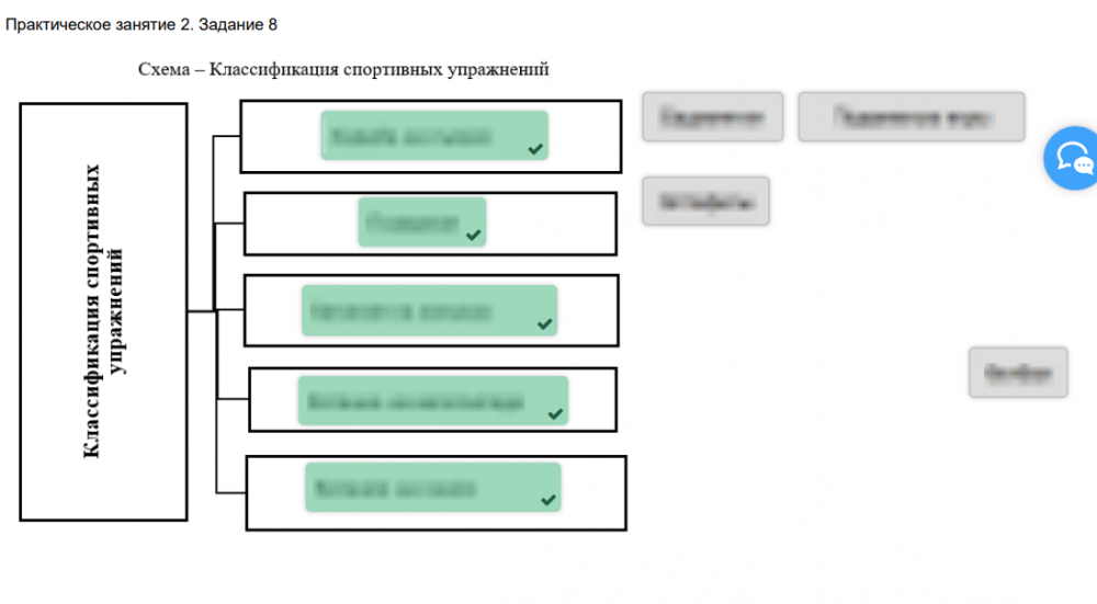 В теории и методике физического воспитания принято несколько классификаций спортивных упражнений. Переместите в пустые блоки схемы названия видов спортивных упражнений, которые относятся к данной классификации. Обратите внимание, что среди предлагаемых вариантов ответов имеются фальшответы (неверные названия видов спортивных упражнений).