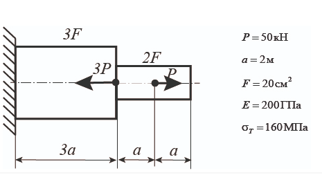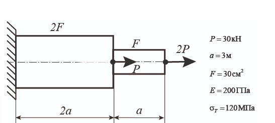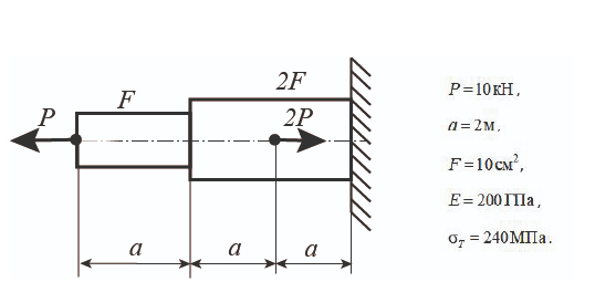Брус (стержень) переменного поперечного сечения находится под действием нескольких продольных сил. Вычислите коэффициент запаса
