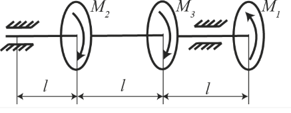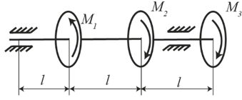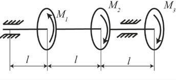 На стальном валу постоянного по длине сплошного поперечного сечения, который вращается равномерно с угловой скоростью w=10 рад/с, установлены три шкива. К одному из шкивов подводится мощность 1=60 кВт, с помощью двух других шкивов мощность передается на рабочие органы машины, при этом известна мощность 2=25 кВт. Расстояние между шкивами равно ±1 м. Допускаемое напряжение для материала вала [т]=50 МПа, допускаемый относительный угол закручивания [0]=0,02 рад/м. Поперечное сечение вала - круг. Используя исходные данные к