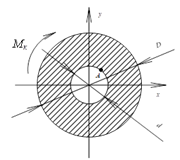 При кручении трубы с внешним диаметром D=3d и внутренним диаметром d в точке A возникают касательные напряжения τ = 35 МПа. Труба изготовлена из пластичного материала τm=140 МПа. Коэффициент запаса nm конструкции равен …